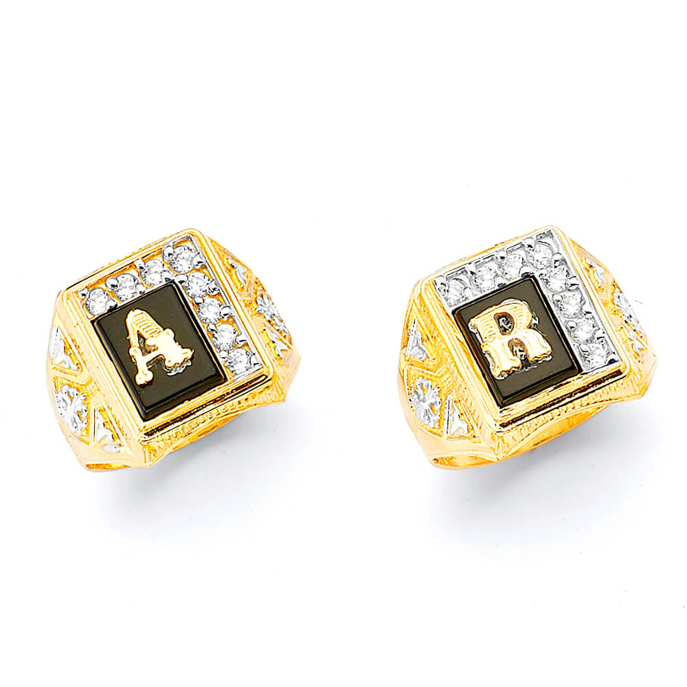 White CZ and Onyx Personalized Mens Ring in 14K Gold