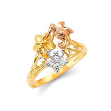 White CZ Flower Ladies Ring in 14K Tri-Color Gold